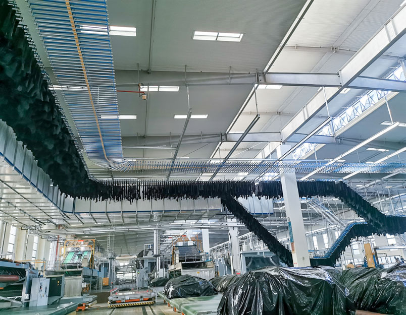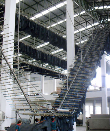 This is the high-hanging automatic conveying hanger drier by single machine applicable for drying various kinds of leather in natural condition.The biggest characteristic of this machine is that it can make full use of workshop space and after-heat of workshop to dry leather.As is dried in natural way(aided with low temperature when necessary),it can realize satisfactory drying effect and meanwhile save energy.