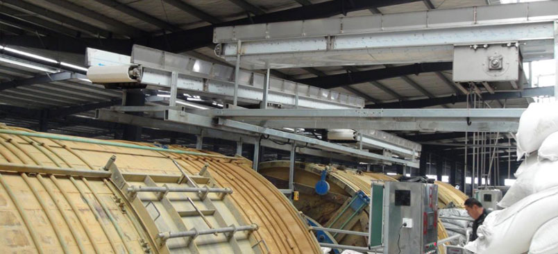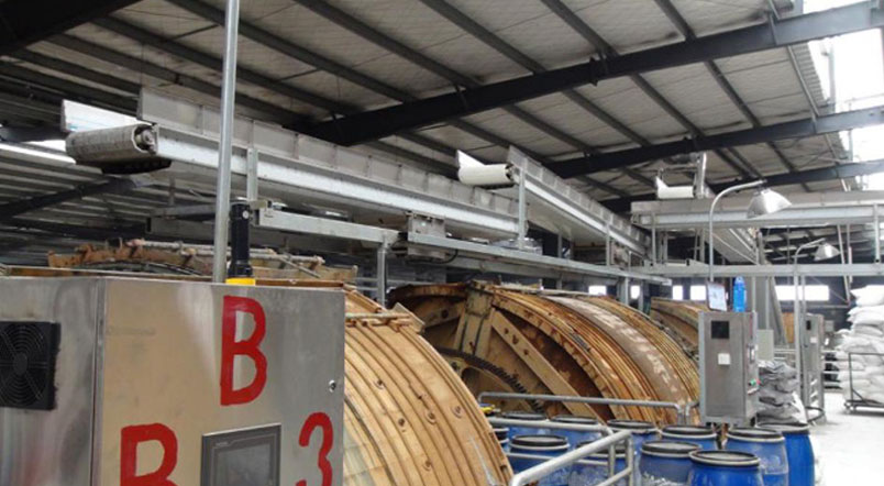 The conveyor belt transports the leather directly from the fur storehouse to the drum that needs to be put into production, which can be weighed automatically. After reaching the specified weight, the drum door closes, and the conveyor belt transports the leather to other drum according to the set program.