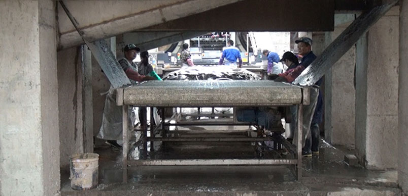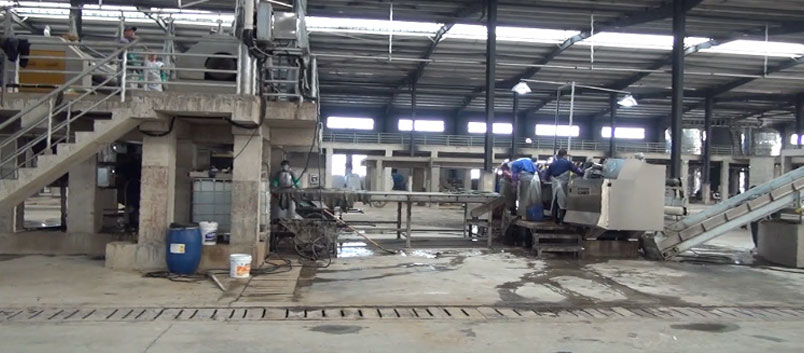 After removing the meat, the skin automatically slides to the conveying line (due to the different tanneries’ technology, some tanneries add an automatic conveying platform here for trimming),After the conveyor line is automatically weighed, it is sent to the designated drum for ash dipping and expansion. The meat dregs scraped from the skin are sent to the meat dregs press by the meat dregs conveying line.